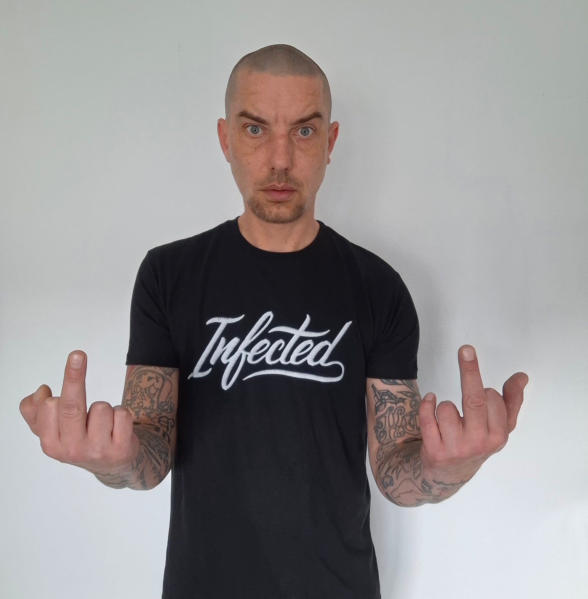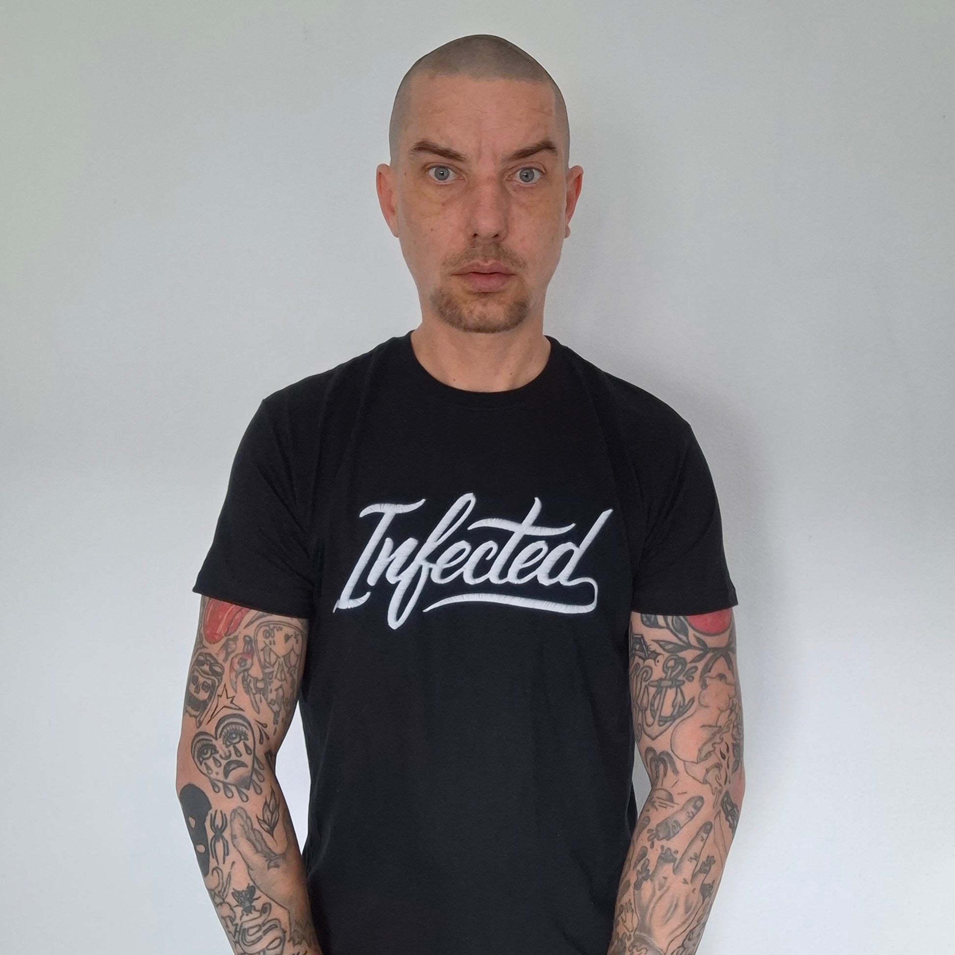 Full colour Infected borduring print op een zwart shirt van 100% katoen, wit Infected logo achter op de rechterschouder.
